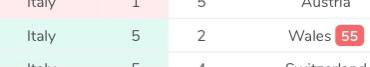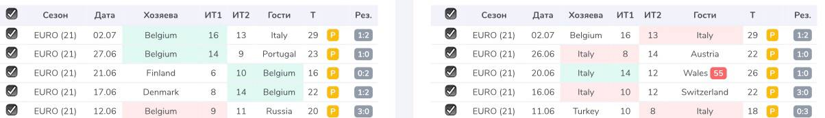 Последний момент с фолами, которым хочу поделиться, — красная карточка в матче. Как видим на скрине ниже, на Евро-2020 Италия обыграла по фолам только Уэльс, и объясняется это как раз удалением. Замечено, что при красной карточке команда, которая осталась в меньшинстве, нарушает правила реже, чем до удаления. В указанном матче до красной на 55-й минуте валлийцы сфолили 10 раз, а после, за 35 минут, всего лишь дважды.