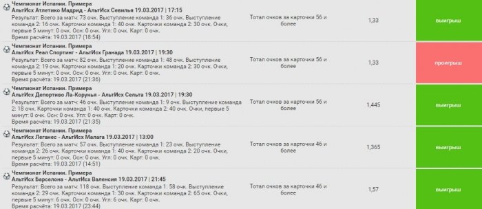 Атлетико - Севилья. В матче первого круга команд было показано 105 очков за карточки. Во всех предыдущих играх последних двух сезонах, Тотал в 56 очков за карточки пробивался. У Севильи во всех выездных матчах в этом году данный тотал заходил, у Атлетико далеко не всегда, но учитывая принципиальность последних игр между командами, тотал должен заходить. Главный арбитр матча Хиль Мансано в этом сезоне показывает в среднем 6.3 жк за игру, данный тотал с его участием пробивался в 8 из 13 матчах.