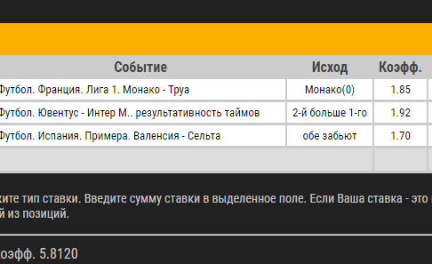 Событие | Исход | Кф. | Результат | Ставка | Выигрыш |