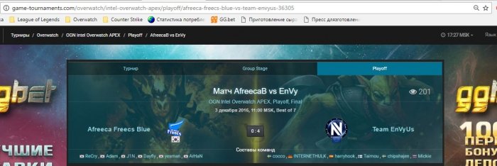 03.12 / 13:00 – Overwatch. OGN Overwatch APEX. Afreeca Freecs Blue – Team EnVyUs: победа Team EnVyUs (коэф. 1,55).