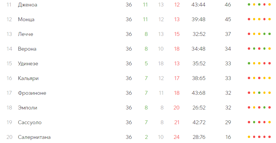 Ну и зона вылета здесь тоже весёлая, как в РПЛ. Сразу 7 команд ещё могут отправиться в пердив чисто математически, даже «Лечче» с 37 очками. У команды впереди игры с «Аталантой» и «Наполи», а это потенциальная баранка в графу очков.