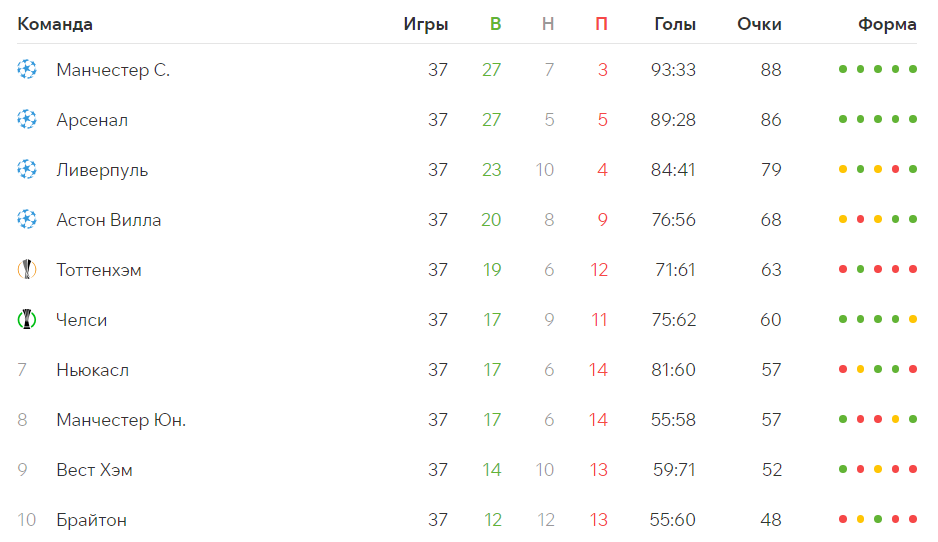 В Англии всё гораздо проще — остался 1 тур и расклады предельно ясны. Все матчи, кстати, начнутся 19 мая ровно в 18:00. «Тоттенхэм» не стал (ну или не смог) делать подарок «Арсеналу», и перед последним туром «Ман Сити» занимает 1-е место в таблице. Шансы на титул — 84%, а если команда Гвардиолы обыграет «Вест Хэм», то заберёт титул. Если не обыграет, будут варианты: