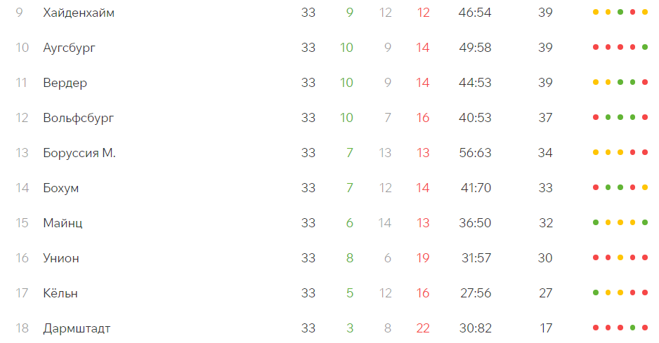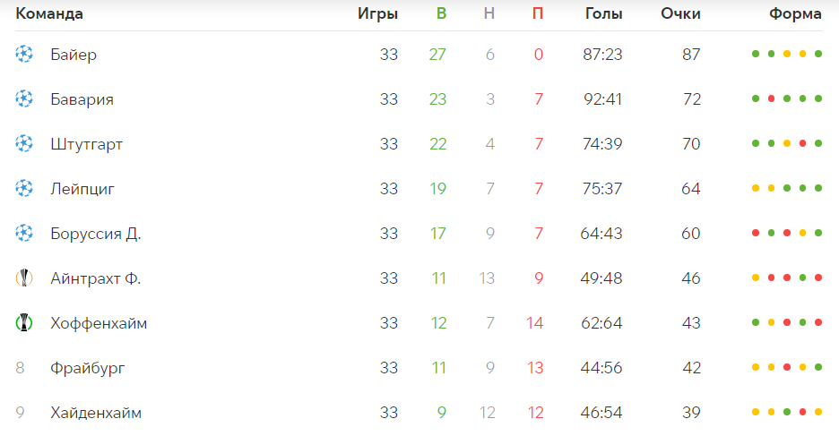 Да, «Байер» уже уработал чемпионскую интригу, а 5-я путёвка в ЛЧ убила борьбу и за четвёрку лучших. Тем не менее в последнем туре шансы попасть в еврокубки есть у «Фрайбурга» и «Хайденхайма»! «Фрайбургу» нужна потеря очков от «Хоффенхайма» в матче с «Баварией» 18 мая, ну и собственная победа над вылетающим «Унионом» в тот же день. Это обеспечит попадание в Лигу Европы.