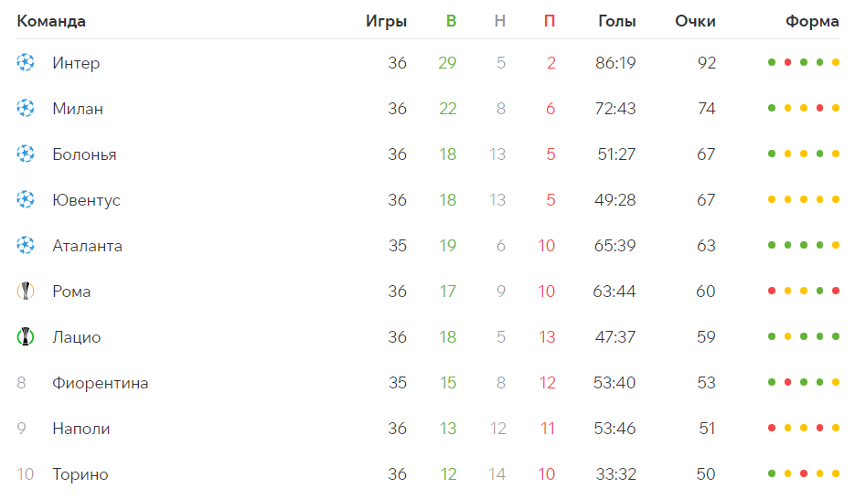 В этом чемпионате победитель определился быстрее всего — «Интер» просто катком проехался по всем, кроме «Сассуоло». А вот за Лигу чемпионов борьба будет нешуточная — сейчас на 5-м месте «Аталанта», но «Рома» и «Лацио» могут сдвинуть её при определённых условиях: