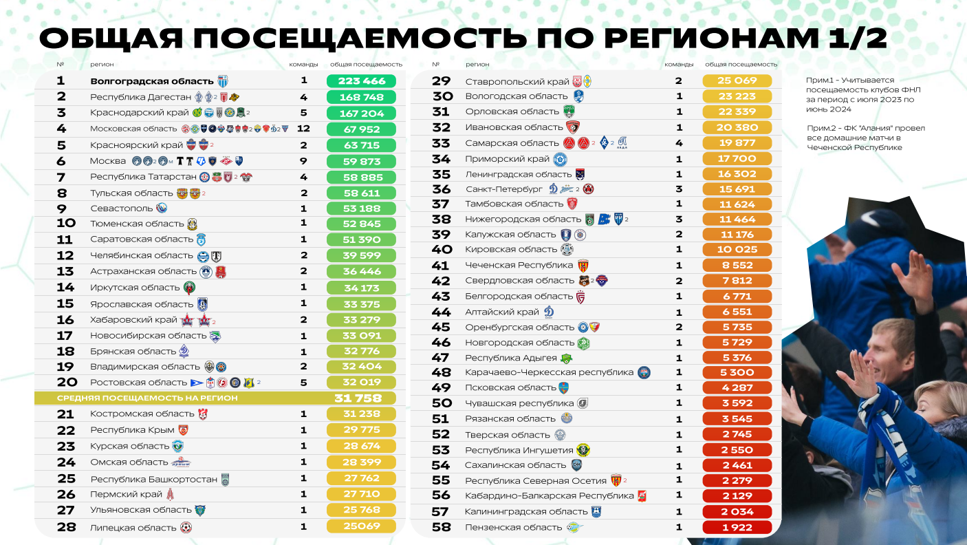 Ещё одно важное изменение — рост общей посещаемости на 28% без учёта выбывших из РПЛ «Торпедо» и «Химок» и вышедших в Премьер-лигу «Балтики» и «Рубина». Кроме того, по сравнению с сезоном-2022/23 увеличилось количество клубов, посещаемость которых превышает общее среднее значение, — с шести до девяти: «Черноморец», «Енисей», махачкалинское «Динамо», КАМАЗ, «Акрон», «Ленинградец», «Сокол», «Нефтехимик» и «Тюмень».