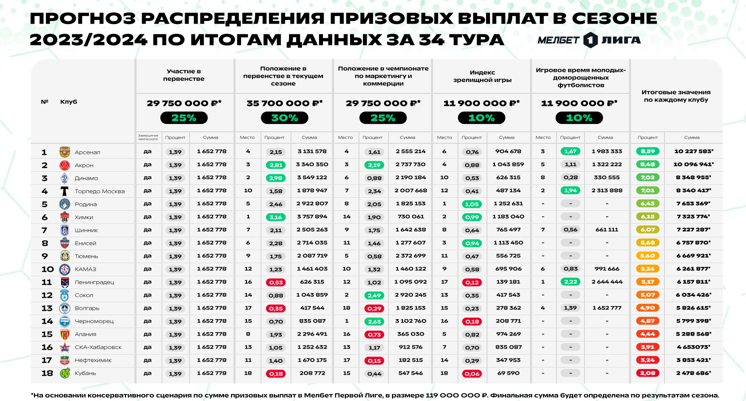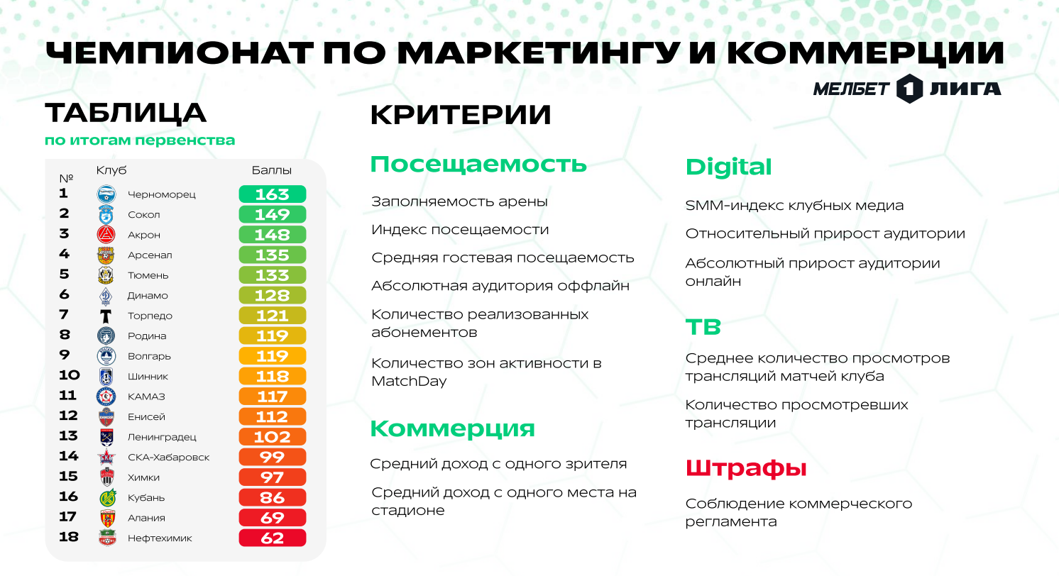 Такую модель финансового поощрения в лиге считают гораздо более эффективной, чем финансирование за итоговое место в турнирной таблице, поскольку даже середняки и аутсайдеры получили возможность заработать дополнительные деньги и сравняться по призовым с чемпионом лиги. Например, «Химкам», победителю Мелбет-Первой лиги прошлого сезона, первое место в чемпионате принесло 3,76 млн рублей. При этом по части медиа и коммерции подмосковный клуб занял только 14-ю позицию, получив выплату в размере 730 тысяч. Обратная ситуация у «Черноморца» — на 15-й строчке в турнирной таблице клуб из Новороссийска заработал 835 тысяч, а за первое место в чемпионате коммерции — 3,1 млн.