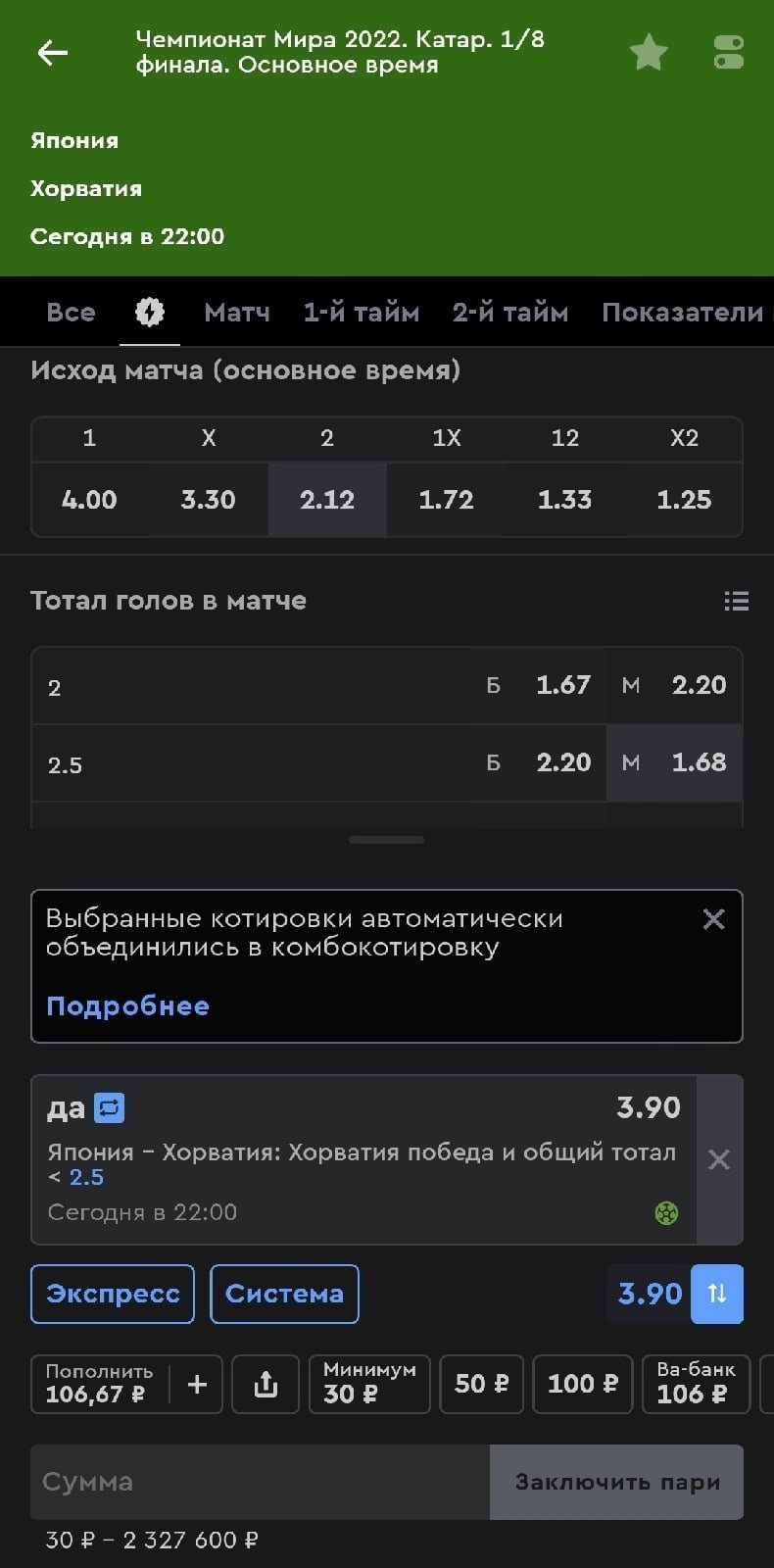 А вот с комбокотировками дело обстоит иначе. Коэффициент после объединения по неизвестной даже службе поддержки причине становится даже выше, чем у потенциального двойника совсем без маржи. Давайте считать: на победу Хорватии давали 2.12 (2.17 было бы без маржи), на ТМ 2,5 — 1.68 (1.73), на комбокотировку из двух этих событий — 3.90. А с нулевой маржой было бы всего 3.75!