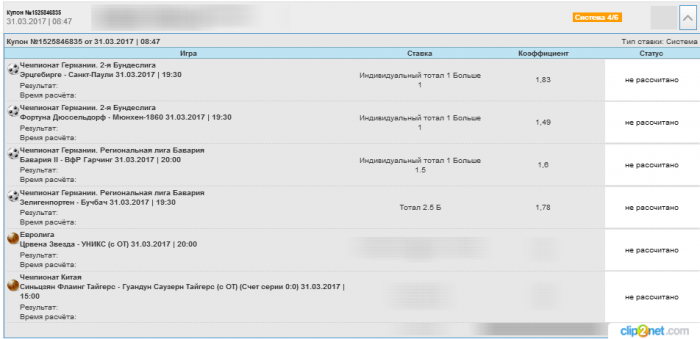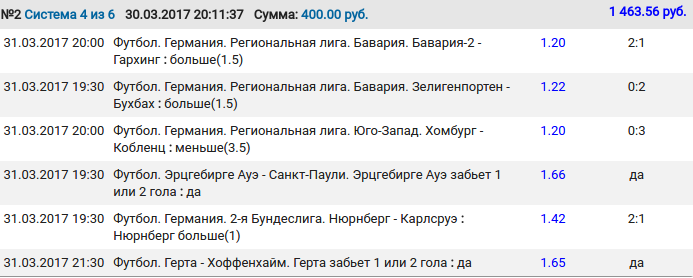 В итоге, я выбрал 6 матчей и взял их по "системе" 4 из 6. Да, я люблю некоторую осторожность. Давайте посмотрим, какие матчи я взял.