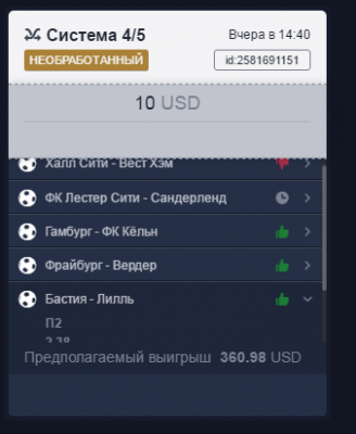 Также и системы - беру кэфы до 1,6, иногда бывают и больше. Стараюсь отобрать события со 100% вероятностью захода) Не всегда проходит, но заходов все равно больше. Как пример, моя последняя система - зашли все 6 событий, общий кэф.-3,45.