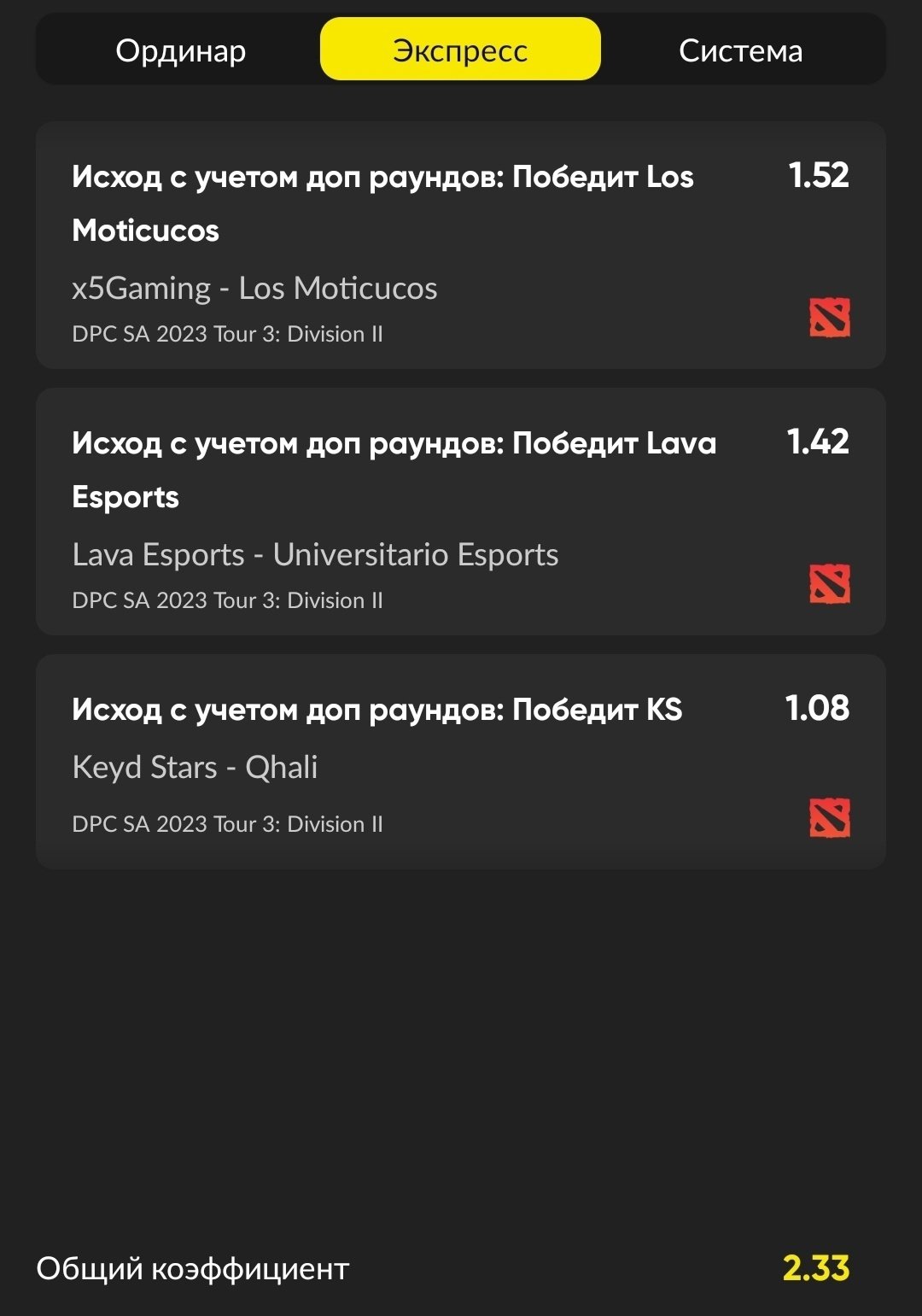 Представим, что вы решили собрать тройник на предстоящие матчи DPC по Dota 2 — они идут друг за другом, поэтому пример будет максимально наглядным.