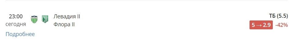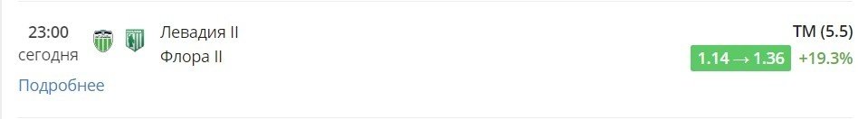Возьмём, например, матч между 2-ми составами «Левадии» и «Флоры» во 2-м по силе дивизионе Эстонии. Если верить nb-bet, то по линии открытия на ТБ 5,5 давали 5.00, а ближе к матчу кэф рухнул до 2.90. ТМ 5,5 при этом вырос с 1.14 до 1.36.