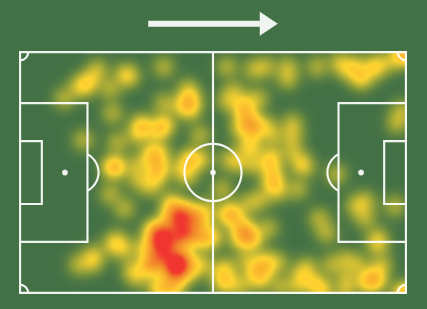 Модрич отыграл низко в позиции оттянутого плеймейкера. Склеивал защиту и полузащиту, умно дирижировал направлением атак. Немного про Модрича: его позиция со смещением на правый фланг очень повторяет карту действий за «Реал» после ухода Каземиро. Смотрите сами.
