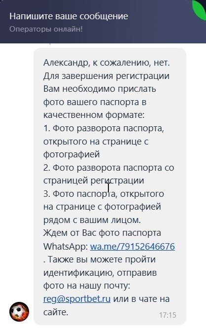 Прикреплю скрин ответа СП «Спортбет» о возможности идентификации в БК после верификации ЦУПИСа через «Тинькофф».