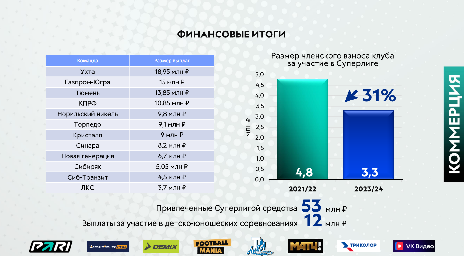 В БЕТСИТИ Суперлиге картина куда более привлекательна. Общая сумма призовых меньше — 114,7 миллиона за сезон-2023/24, однако и клубов там всего 12, а не 18, как в Мелбет-Первой лиге. Поэтому футзальный лидер общего зачёта получил почти в два раза больше денег, чем футбольный. Больше всех заработала «Ухта» — 18,95 миллиона, за ней идут «Газпром-Югра» — 15, «Тюмень» — 13,85 и КПРФ — 10,85. Меньше всех денег получил ЛКС — 3,7 миллиона.