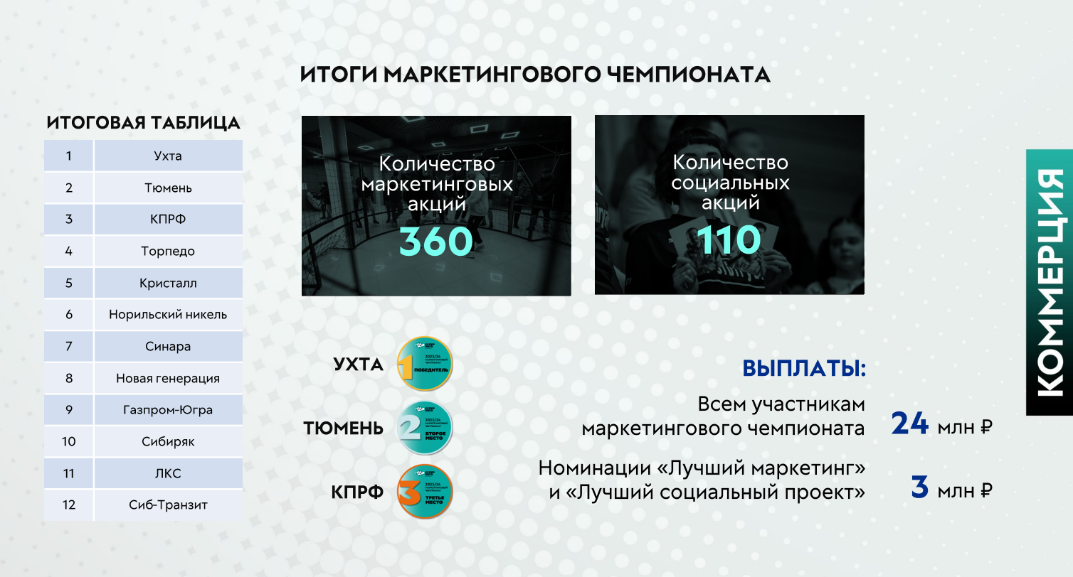 К началу шестого месяца Маркетиногового чемпионата (1 февраля) в лидерах маркетингового чемпионата «Ухта» (552 балла), «ИрАэро» (516) и «Тюмень» (483). Причём иркутский клуб, который в регулярке идёт предпоследним и точно пролетит мимо плей-офф, почти полгода лидировал в маркетинговом турнире. А вот главные претенденты на победу в регулярке «Норникель» и «Газпром-Югра» в развитии медиа отстают — девятые и 12-е соответственно.