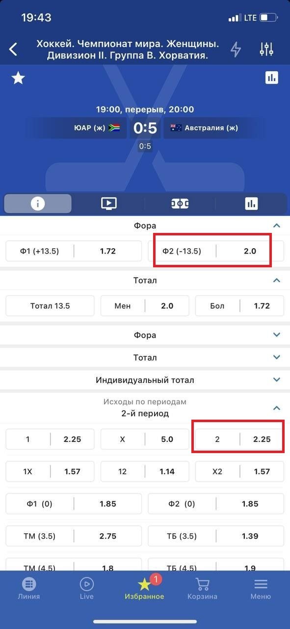 Ещё хватает событий, где котировки в целом на игру верные, а вот на отдельные четверти или периоды взяты с какого-то другого матча. Например, недавно в хоккей рубились женские сборные ЮАР и Австралии. После первого периода австралийки вели 5:0, давали фору (−13,5), но во втором на победу явного фаворита можно было поставить за 2.25. Ставил сам, потому что сперва реально не понял, что за чертовщина — отдали выигрыш.