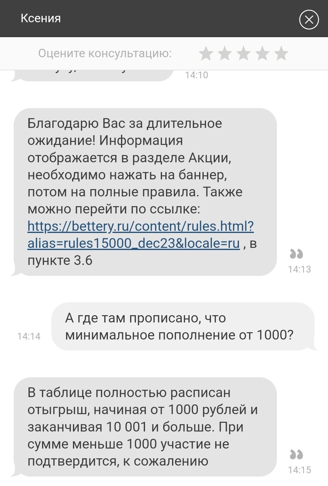 Они пришли при написании этого материала: оказывается, что акция доступна при 1-м депе от 1000 рублей. Когда я уточнил у оператора, а где этот пункт в правилах акции, меня отослали к 3.6.
