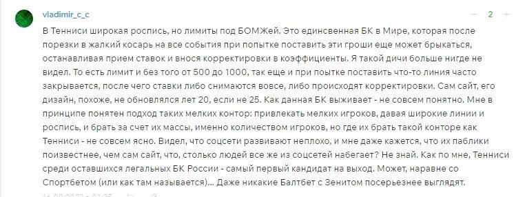 Вспомните хоть одну букмекерскую контору, которая даёт поставить на исходы в АПЛ максимум около 20 тысяч рублей? Tennisi даже на некоторые эксклюзивы может расщедриться на такие максимумы, хотя именно эта контора чаще всего вызывает мысли: «А зачем это всё, если нет лимитов?»
