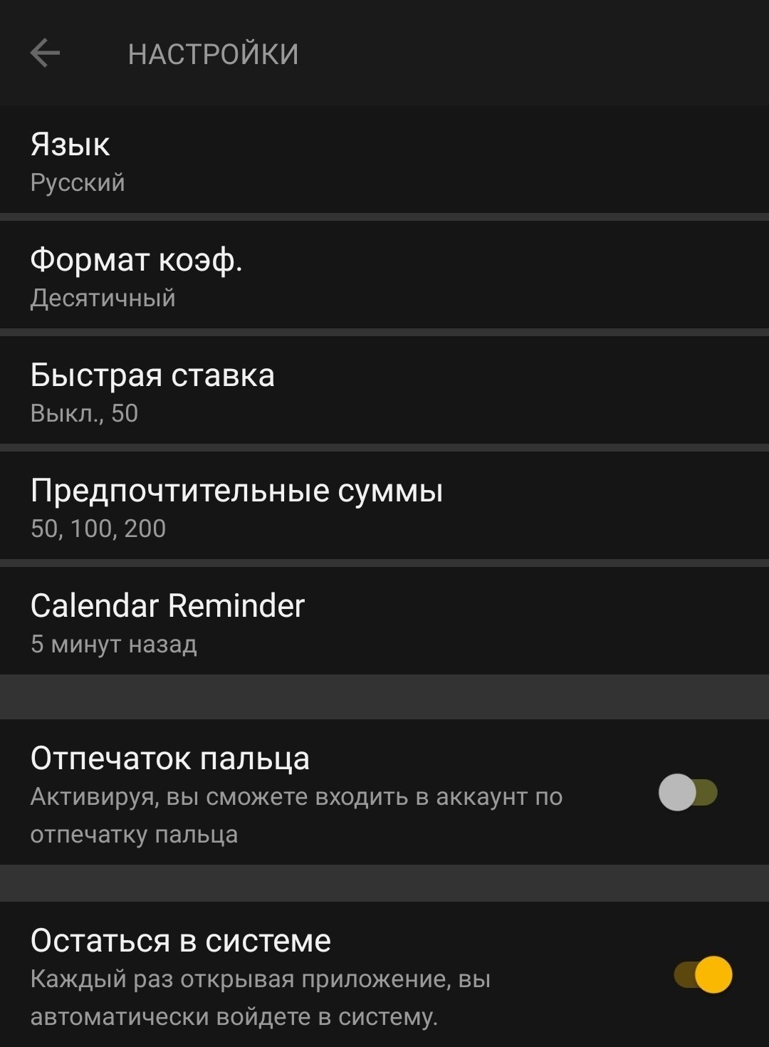 Единственный вопрос к интерфейсу — а что с локализацией? Что за «Calendar Reminder» (напоминания о скором начале избранных событий) и «Wagering» (бонусы с условием отыгрыша)? При этом выбрать английский язык в настройках нельзя…
