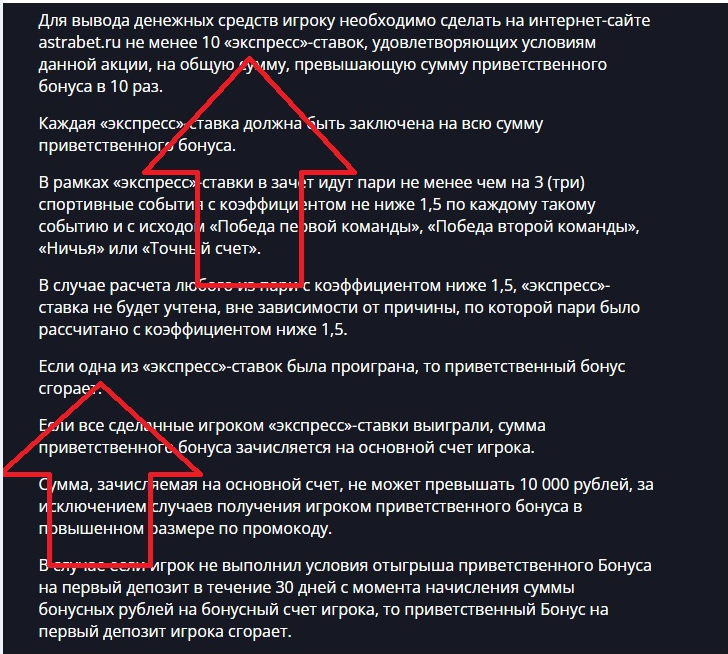 О деньгах и ставках. Точнее, о бонусах. Приветственный бонус в Astrabet есть, аж 10 тысяч рублей и в сумме 100% от депозита. И даже кешбэк имеется в 12%. Но что они есть, что их нет — игроку без разницы. Условия практически исключают возможность получить эти деньги.