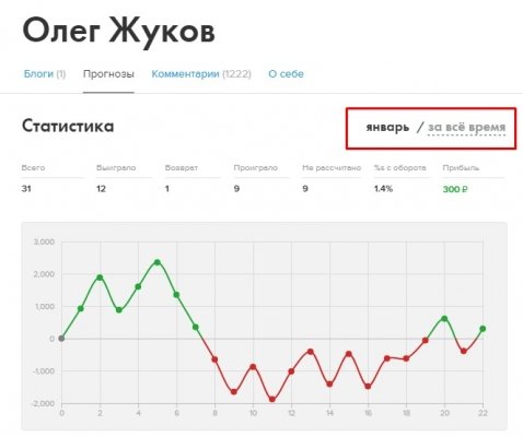 Вот тут есть самое главное. В профилях экспертов и гандикаперов добавилось то, чего не было раньше. И то, что иллюстрирует успешность его прогнозов лучше всего.График проходимости прогнозов. Он располагается на вкладке «Прогнозы» в профиле эксперта или гандикапера. На графике представлена статистика за текущий месяц, а также за все время работы на сайте: