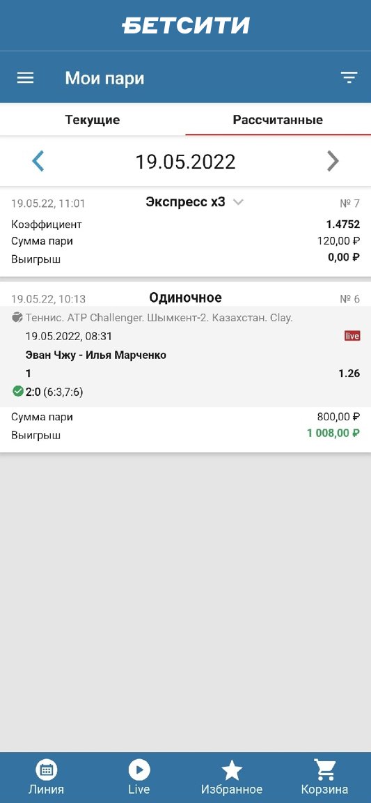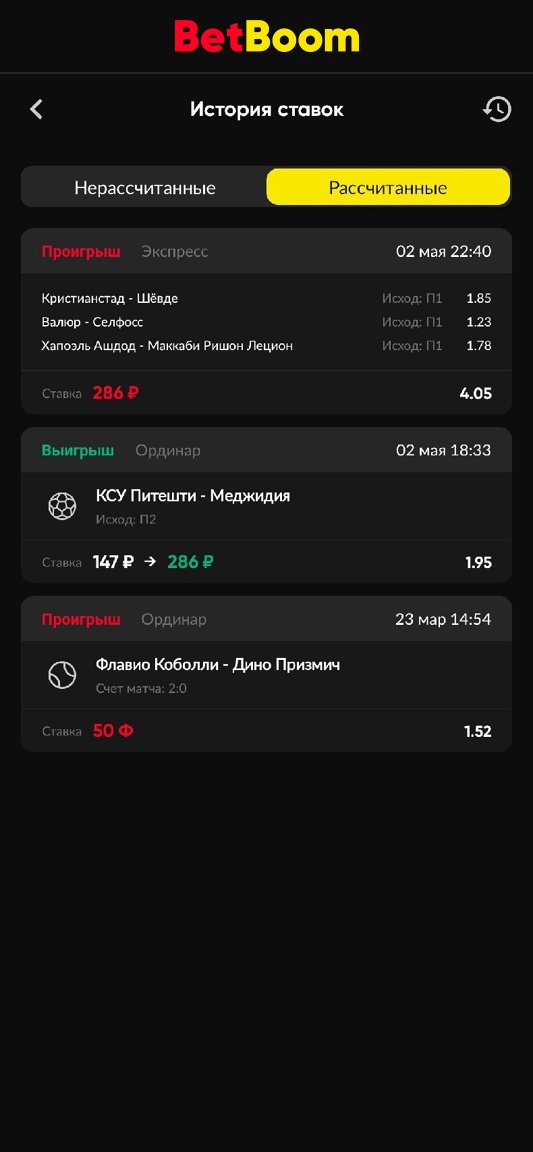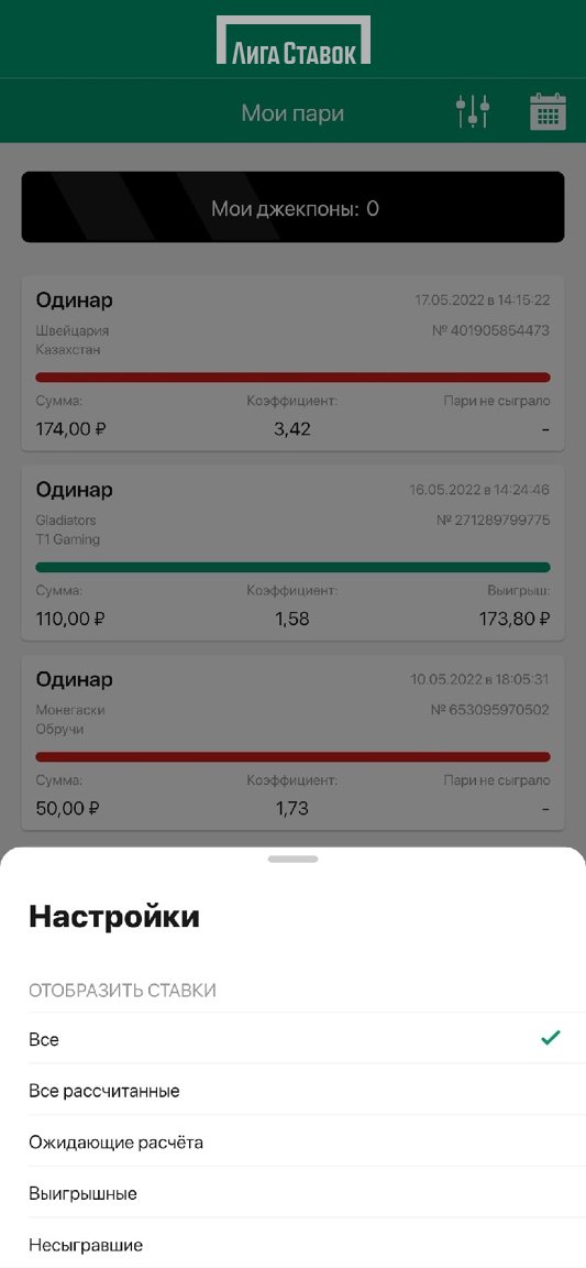 У «Лиги Ставок» одно из самых удобных меню истории ставок: отфильтровать архив в приложении можно как по дате (с удобным виджетом-календарём), так и по результату (рассчитанные, выигрышные, не сыгравшие и ожидающие расчёта пари). В BetBoom же есть деление пари лишь по факту расчёта.