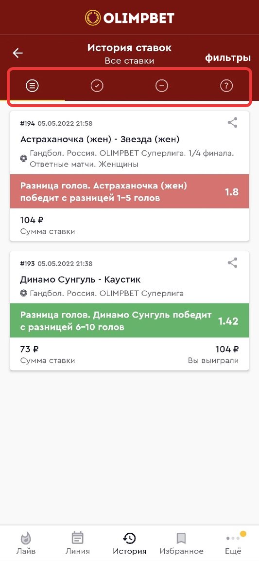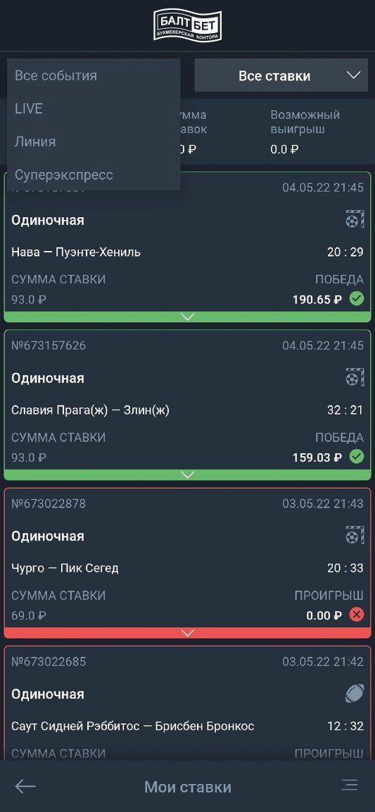 В «Олимпе» всё просто: месяц хранения и фильтр по выигранным, проигранным и нерассчитанным пари. В «Балтбет», ко всему прочему, можно отфильтровать ставки, сделанные в лайве и прематче, отдельно можно выделить и купоны «Суперэкспресса».