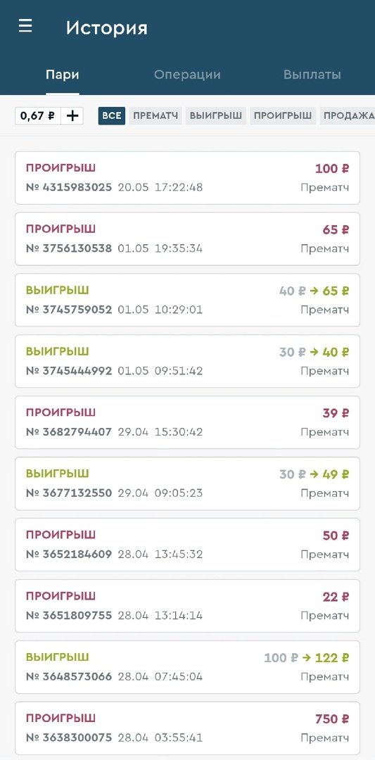 Отметить стоит лишь один интересный факт: в разделе «Мои пари» отображаются только нерассчитанные купоны, а для отображения истории ставок необходимо выбрать пункт меню под названием «Пари, операции, выплаты». Это нельзя назвать минусом, но решение не самое очевидное, особенно для новичков.