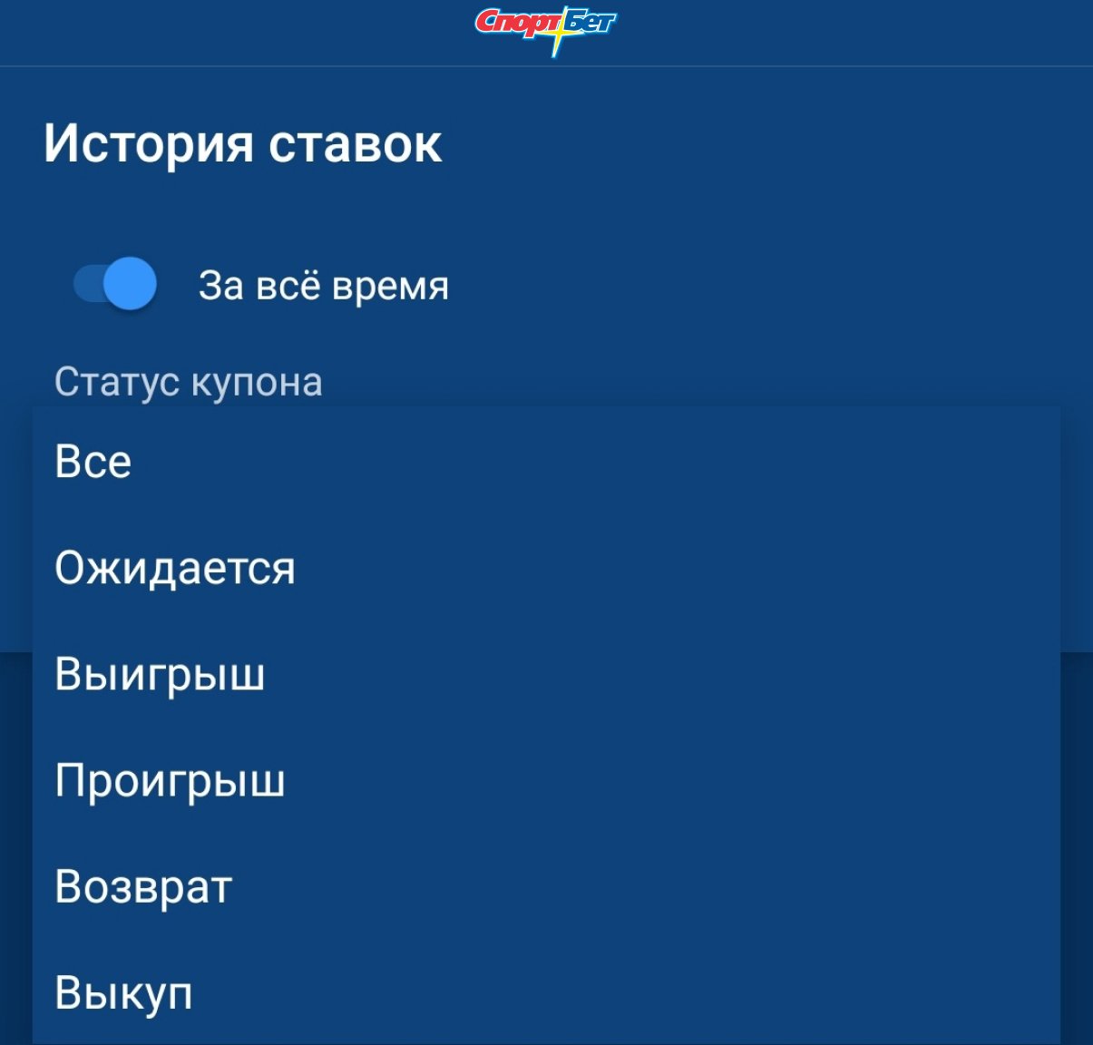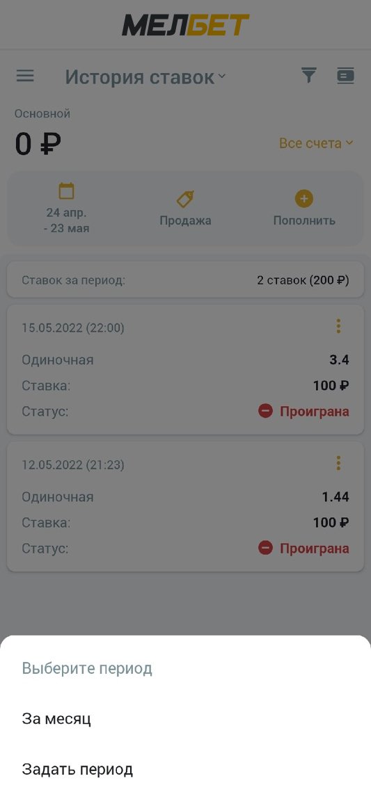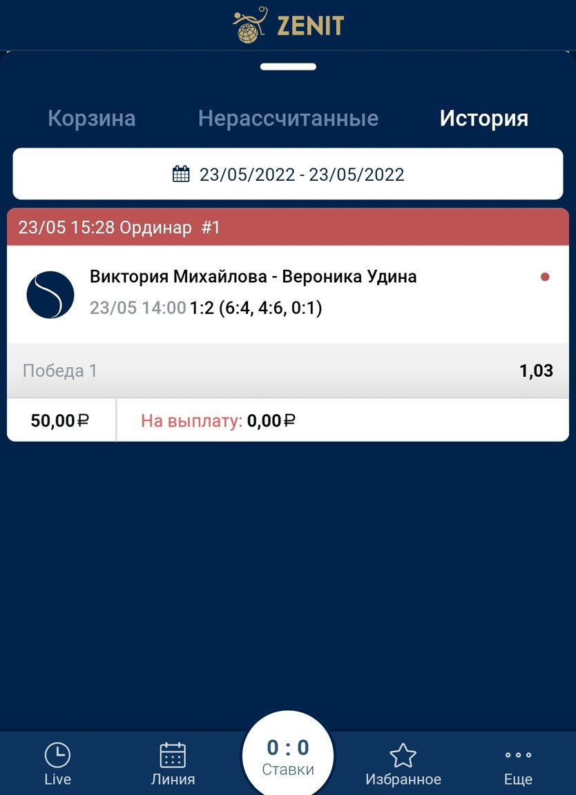 А вот у «Зенита», напротив, одна из самых неудобных историй ставок, по крайней мере в приложении. Во-первых, она не реализована отдельным окном, а представляет из себя всплывающее меню. Ну а во-вторых, отфильтровать ставки можно только по времени.