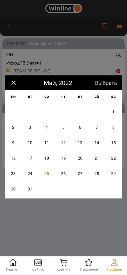 Реализован фильтр по выигранным, проигранным и отменённым пари, а навигация по датам представляет из себя виджет-календарь, в котором к тому же можно листать даты, как в каком-нибудь матч-центре. Небольшая деталь, но приятная.