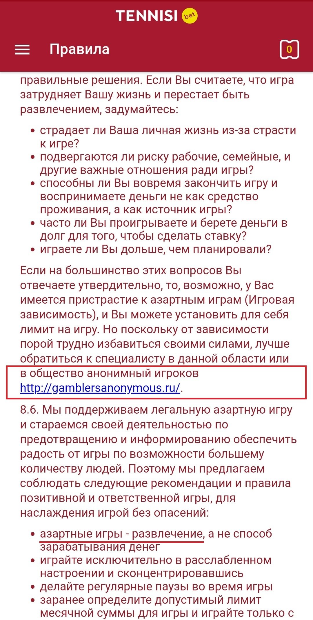 Здесь по кайфу болеть за хруст французской булки или английский футбол в топовых матчах и заряжать недорогие смелые экспрессы с точными счетами, потому что если зайдёт, то ещё и бонус прилетит. «Тенниси» — превосходный пример девиза «Ставки — это развлечение». Недаром он у конторы даже в правилах прописан. Наряду с гиперссылкой на сайт, где помогают людям с игровой зависимостью.