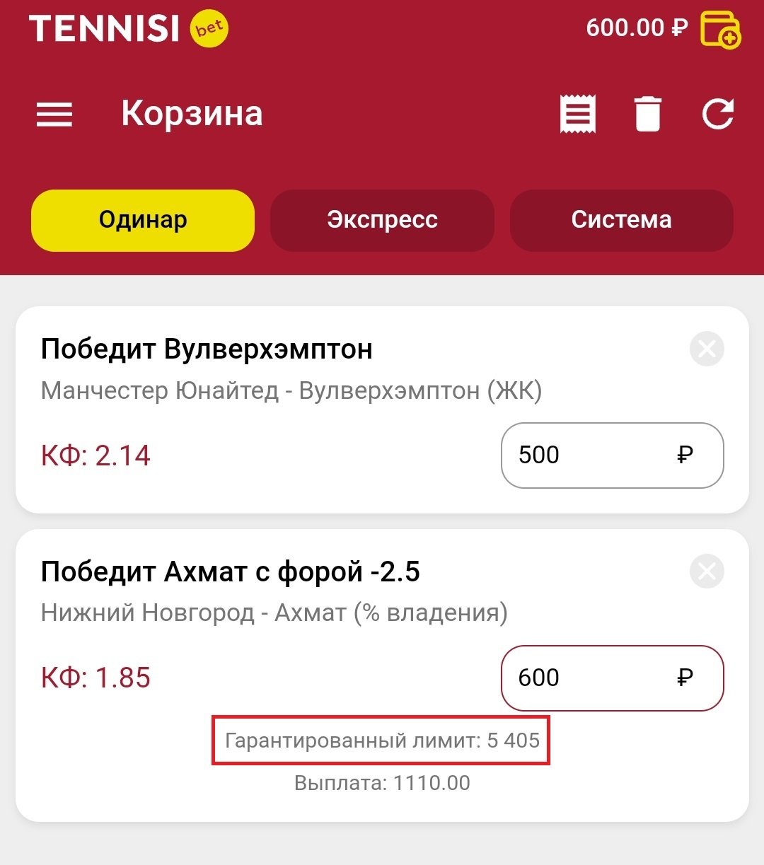 Букмекер вряд ли подойдёт для желающих ставить крупно: в правилах БК не прописаны максимумы по выигрышам, они ограничены лимитами на конкретный кэф. Глобально, продукт «Тенниси» настроен так, что ординаром в нём можно выиграть максимум миллион рублей (не чистыми). Это на П1/П2 топового футбика вроде РПЛ в день матча. На совсем громкие вывески, наверное, может быть и больше, но в целом пределы именно такие. Далее по убывающей в зависимости от уровня турнира и рынка.