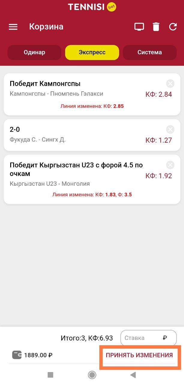 Дальше — больше. Кэф в лайве меняется быстро, и если в процессе оформления ставки он изменился, «Тенниси» сначала потребует подтвердить изменение коэффициента, а потом только разрешит нажать на «Сделать ставку».