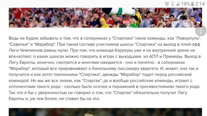 Однако, я жду сенсаций в домашних играх "Спартака". Ближайшая игра "Спартака" с "Севильей" и я не удивлюсь, если именно ее "Спартак" выиграет, а вот "Марибору" уступит на своем поле, не сумев взломать оборону гостей и получив в контрвыпаде. Это в духе "Спартака", да и вообще российского футбола. Так что "Спартак", по мне, точно не выйдет из группы в плей-офф Лиги Чемпионов, но в Лигу Европы попасть, само собой, может.