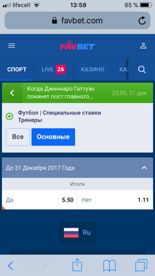 Учитывая сумбурность в клубных делах «Милана», о поверить в такой сценарий вполне реально. В связи с этим я решил прошерстить предлагают ли по этому поводу что-то букмекерские конторы. В украинском Фаворите я нашел ставку, которая подходит под мои критерии (я действительно жду отставки Гаттузо в скором времени, почему бы и не до Нового Года).