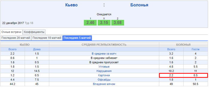 Первой таблицей появляется средние показатели команд по количеству желтых карточек и даже красных(там же графы "дома", "на выезде"). Безусловно интересная информация, но листаем ниже: