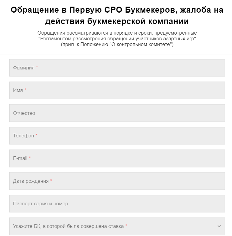 — Игрок, с использованием внешняя ссылкаВнешние ссылки запрещены на сайте СРО, оставляет обращение. В форме есть обязательные поля, которые касаются контактных данных игрока, названия букмекерской компании и сути обращения.