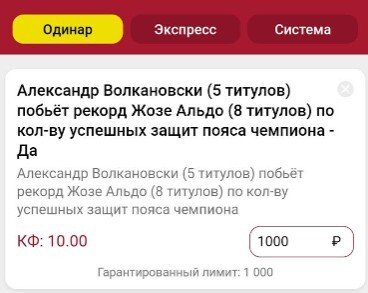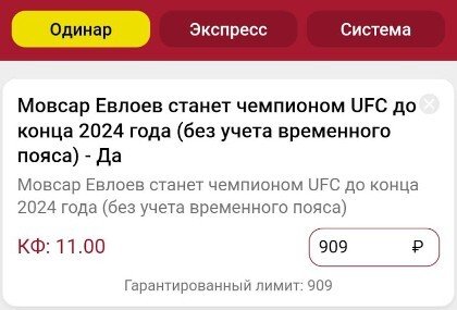 Евлоеву нужно победить Арнольда Аллена, что уже не простая задача. Затем предстоит столкнуться с топовой оппозицией в лице Брайана Ортеги или Макса Холлоуэя, и только потом проводить сложный бой за пояс. Рискованная ставка, высокий кэф, всё вроде неплохо, но без хорошего лимита это пари остаётся просто фановым.