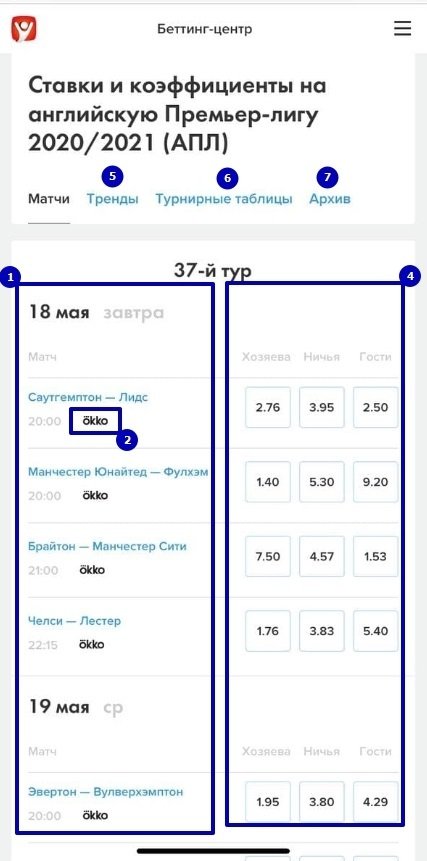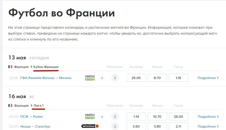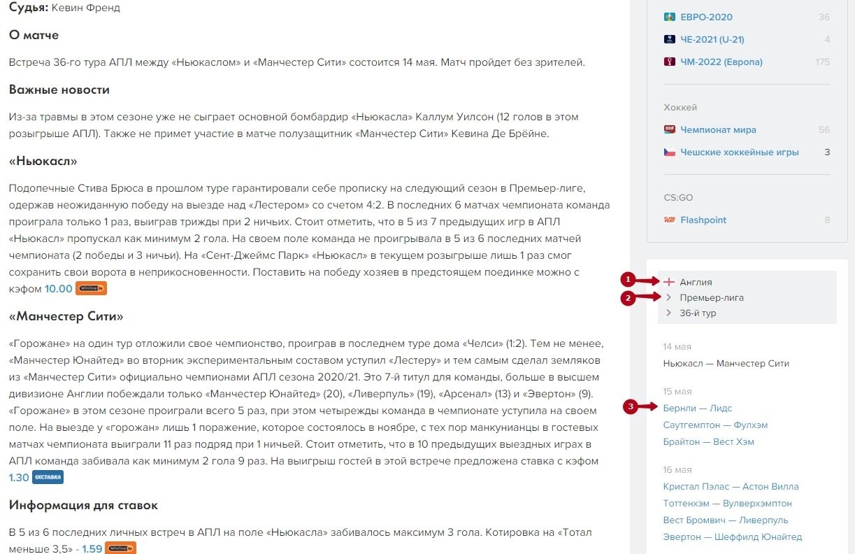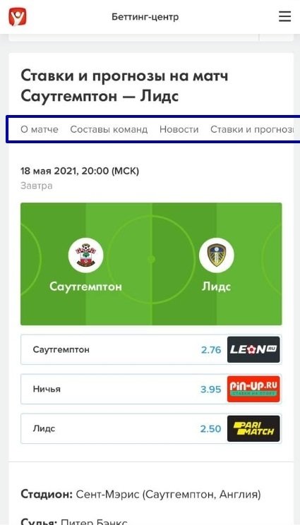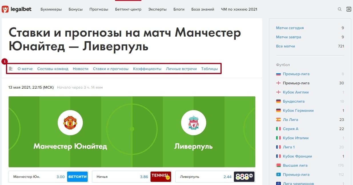 Первой представлена основная инфа о встрече: дата, время, соперники, коэффициенты, судья и стадион. Всё это подкрепляется превью, в котором мы пишем о форме команд, турнирных раскладах, интересных фактах и информации для ставок.