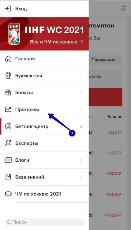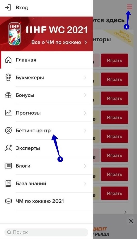 На мобильной же версии необходимо вызвать меню и выбрать раздел «Беттинг-центр» (здесь и дальше первыми приведены скрины мобильной версии, затем декстоп).