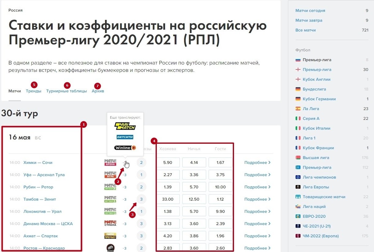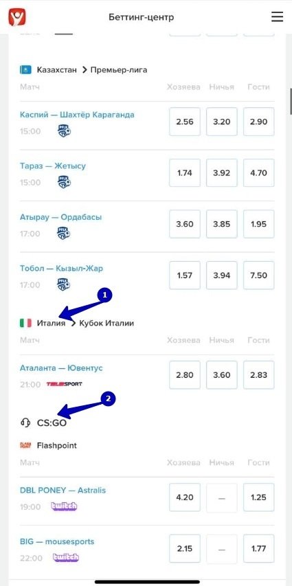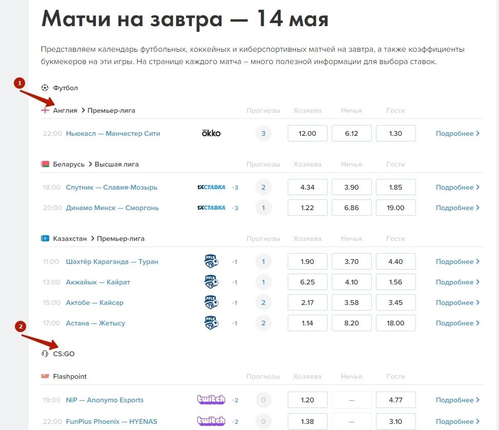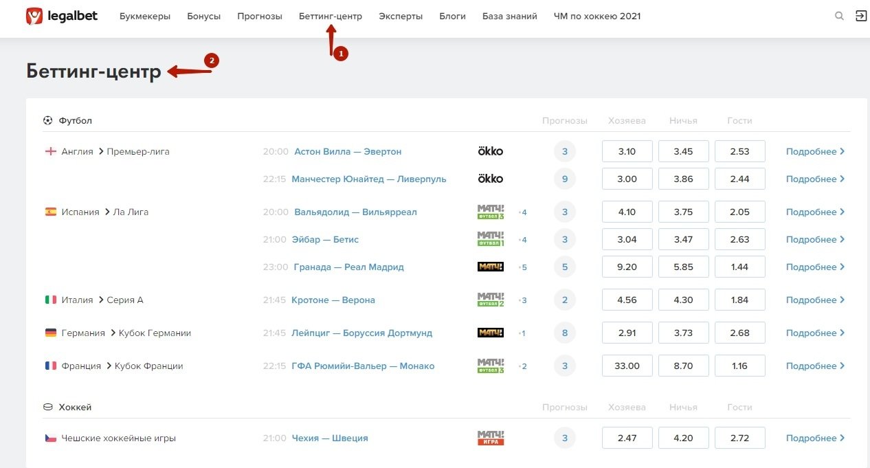 На странице предстоящих матчей можно попасть в отдельную страну (1) или переключиться на конкретный вид спорта (2).