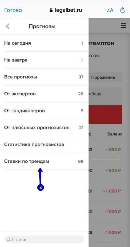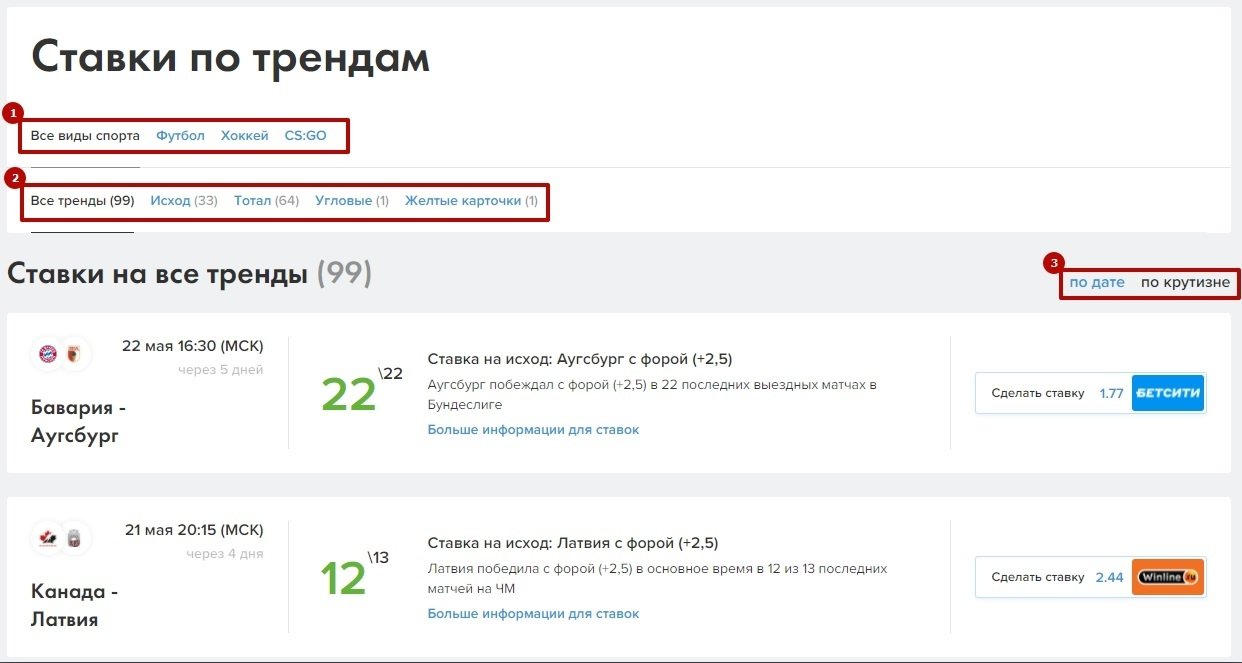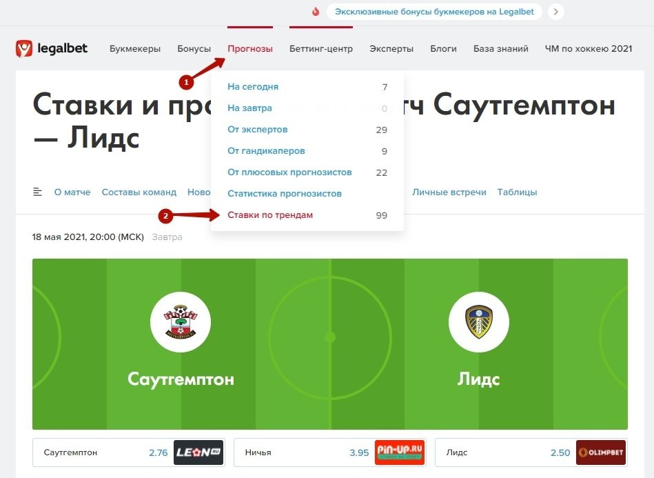 Отдельно расскажу, где можно найти сразу все тренды из БЦ. В верхнем меню нужно навести курсор на «Прогнозы» и в выпадающем списке выбрать «Ставки по трендам».