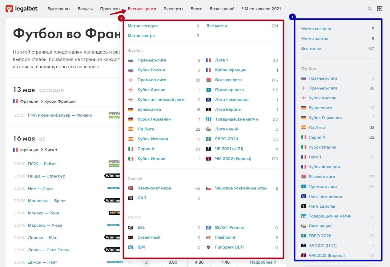 В разделе БЦ на конкретный турнир удобно переключаться через боковую панель в правой части экрана (1). Или можно воспользоваться выпадающим меню турниров, наведя мышкой на «Беттинг-центр» в верхнем меню (2) — этот способ работает с любой страницы сайта.