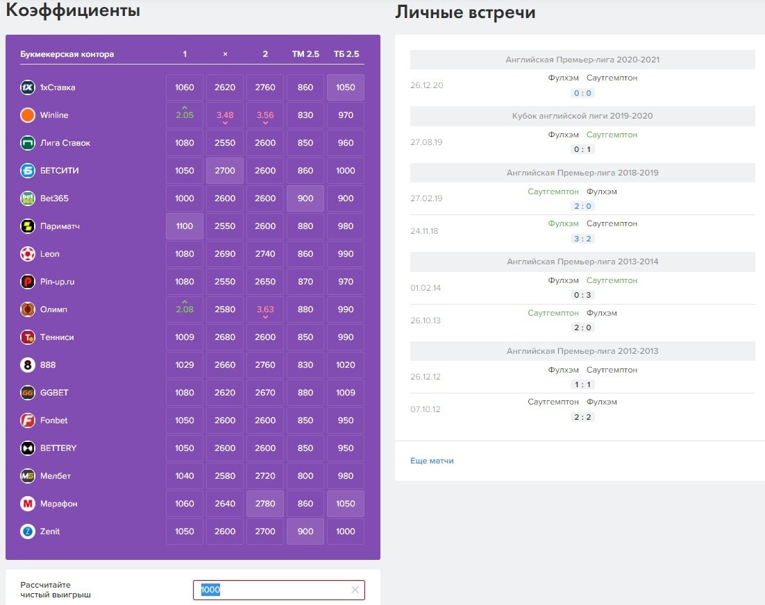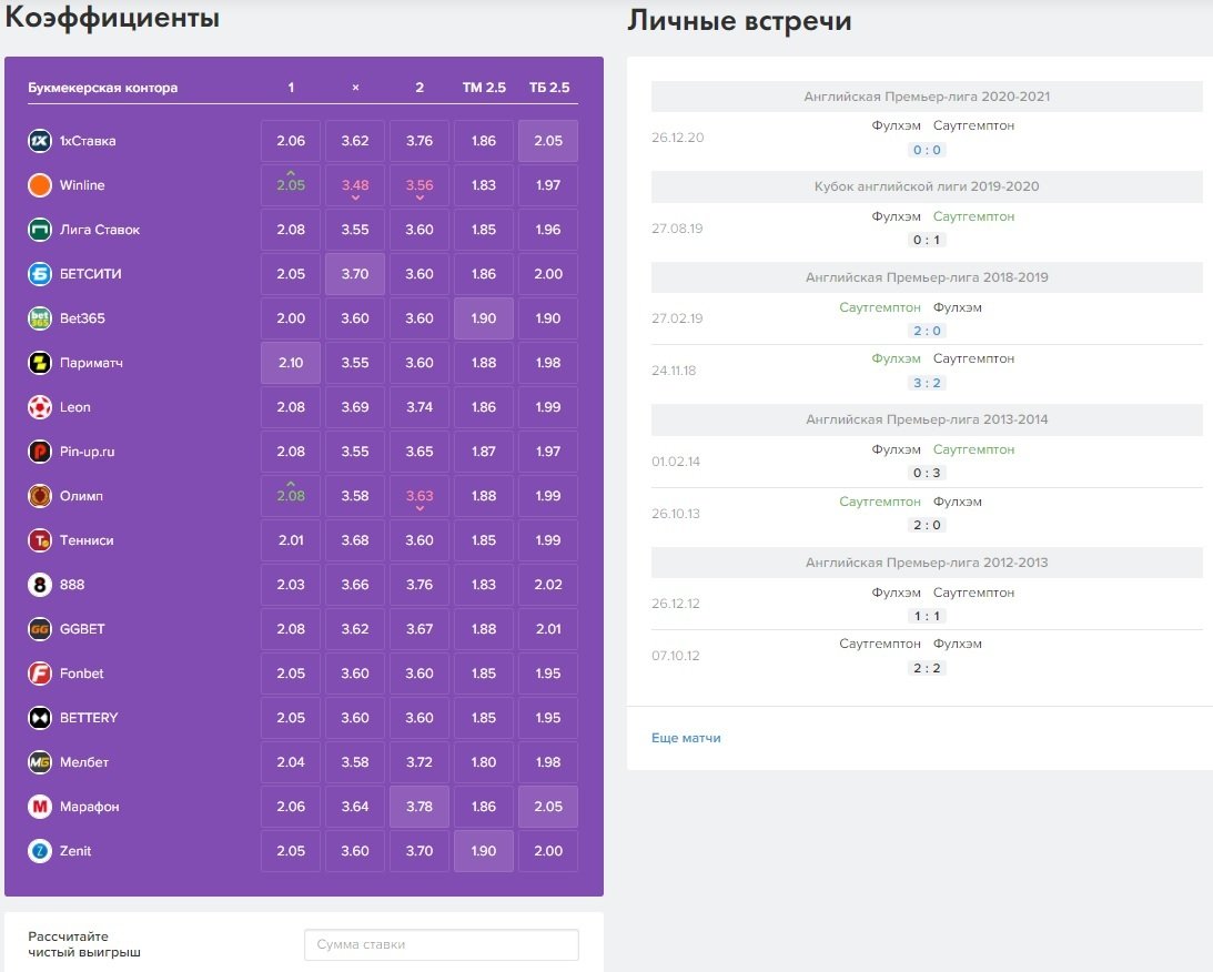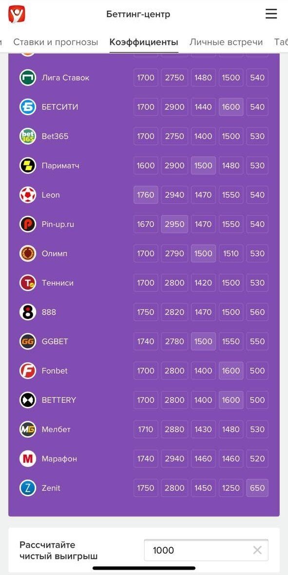 На данный момент в этом блоке можно увидеть сравнение 17 из 20 легальных букмекеров. Mostbet и «Балтбет» не смогли предоставить фиды, а с BetBoom возникли технические проблемы. Лучшие коэффициенты для удобства выделены, даже если эта БК не является нашим партнёром. А также с помощью этого блока можно рассчитать чистый выигрыш от вашей ставки.