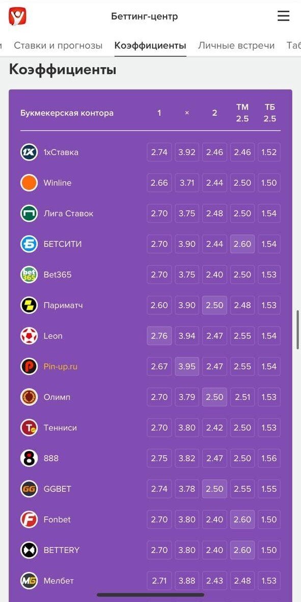 Чуть ниже находятся сводная таблица коэффициентов на самые популярные исходы от большинства легальных БК и список личных встреч команд.