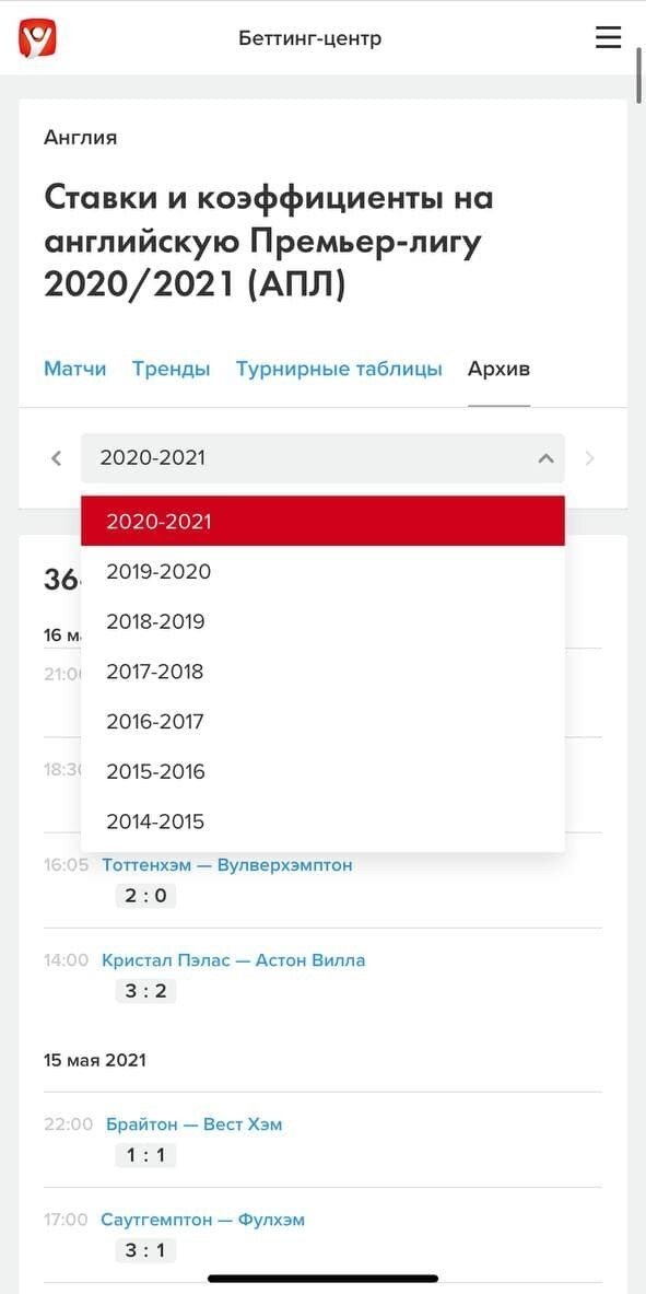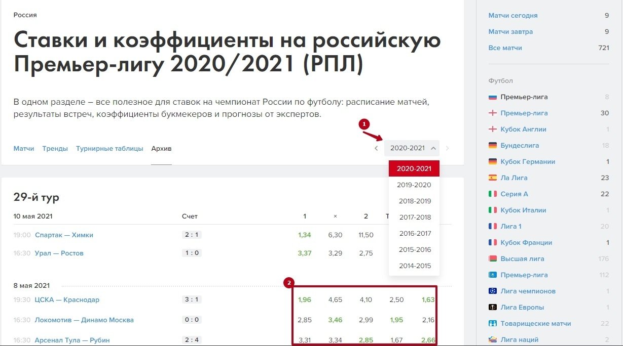 В архиве хранятся все сезоны, которые были представлены у нас на сайте (1). Помимо результатов матчей, там можно найти предлагаемые тогда коэффициенты (2). Зелёным выделены сыгравшие котировки (этот пункт только на десктопе).