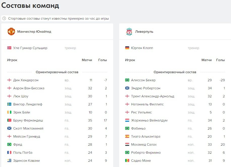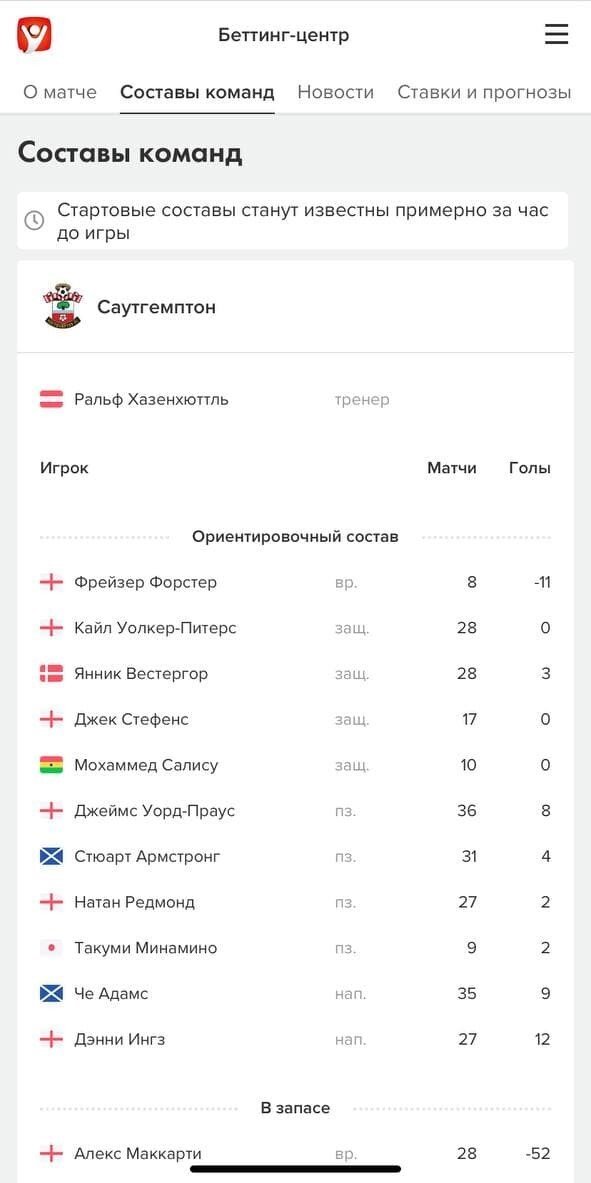 Следом идут составы команд. За два дня до игры мы выставляем ориентировочные составы, а как только из официальных источников станет известно о стартовых, мы сразу же отобразим их и в нашем Беттинг-центре. Время варьируется в зависимости от турнира — обычно старты появляются примерно за час до игры.