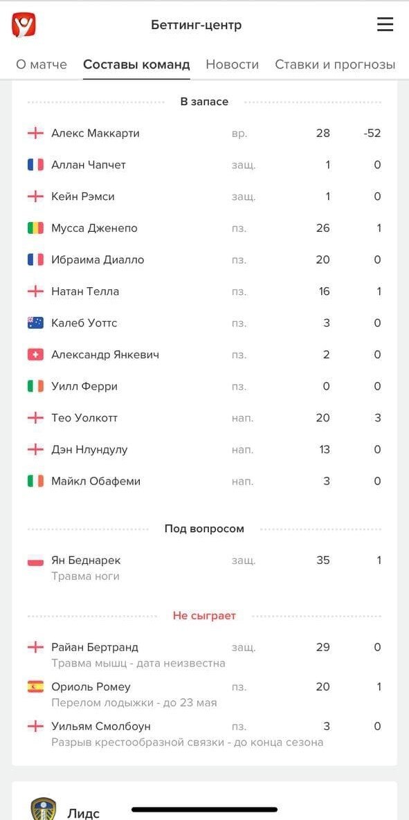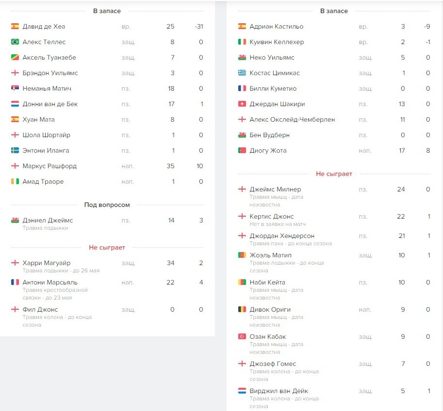 Ниже, помимо запасных, есть список травмированных, дисквалифицированных и других игроков, пропускающих матч. В категорию «Не сыграет» попадают только те футболисты, в отсутствии которых мы уверены и получили подтверждение в надёжных источниках. Если по игроку остаются хоть малейшие сомнения, то он будет со статусом «Под вопросом».