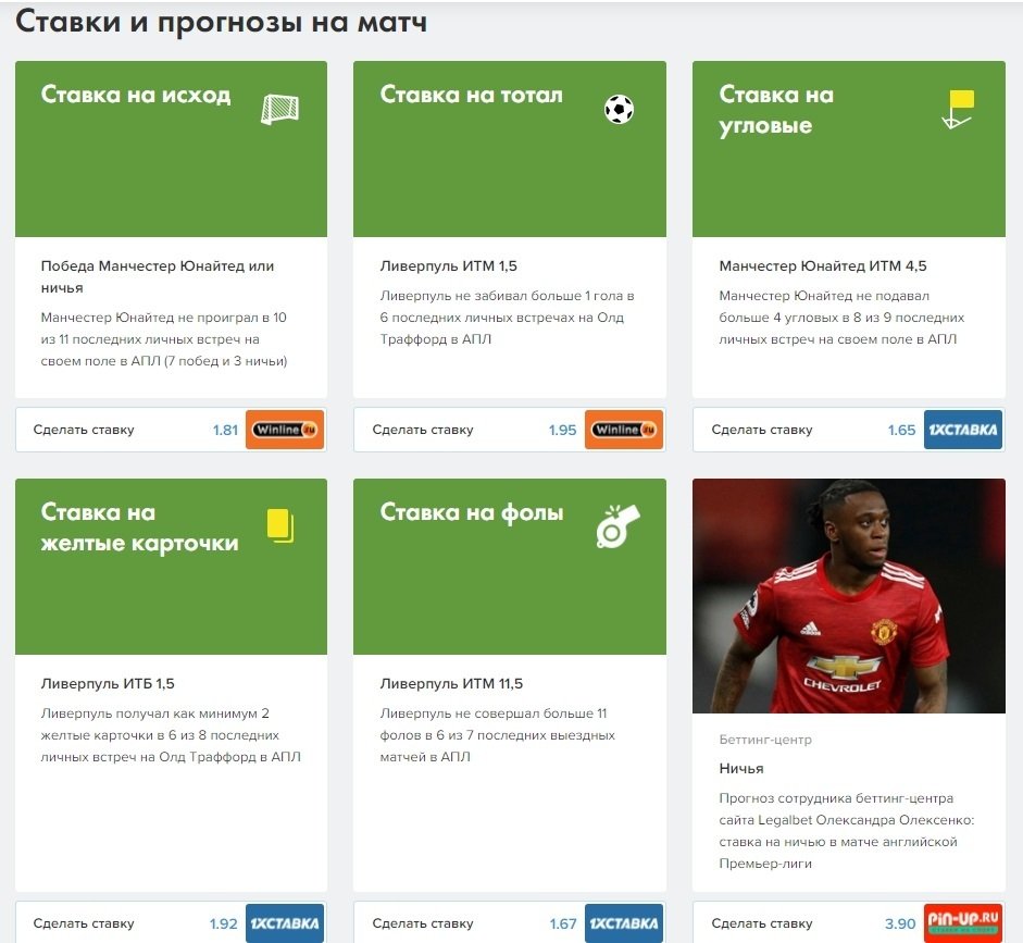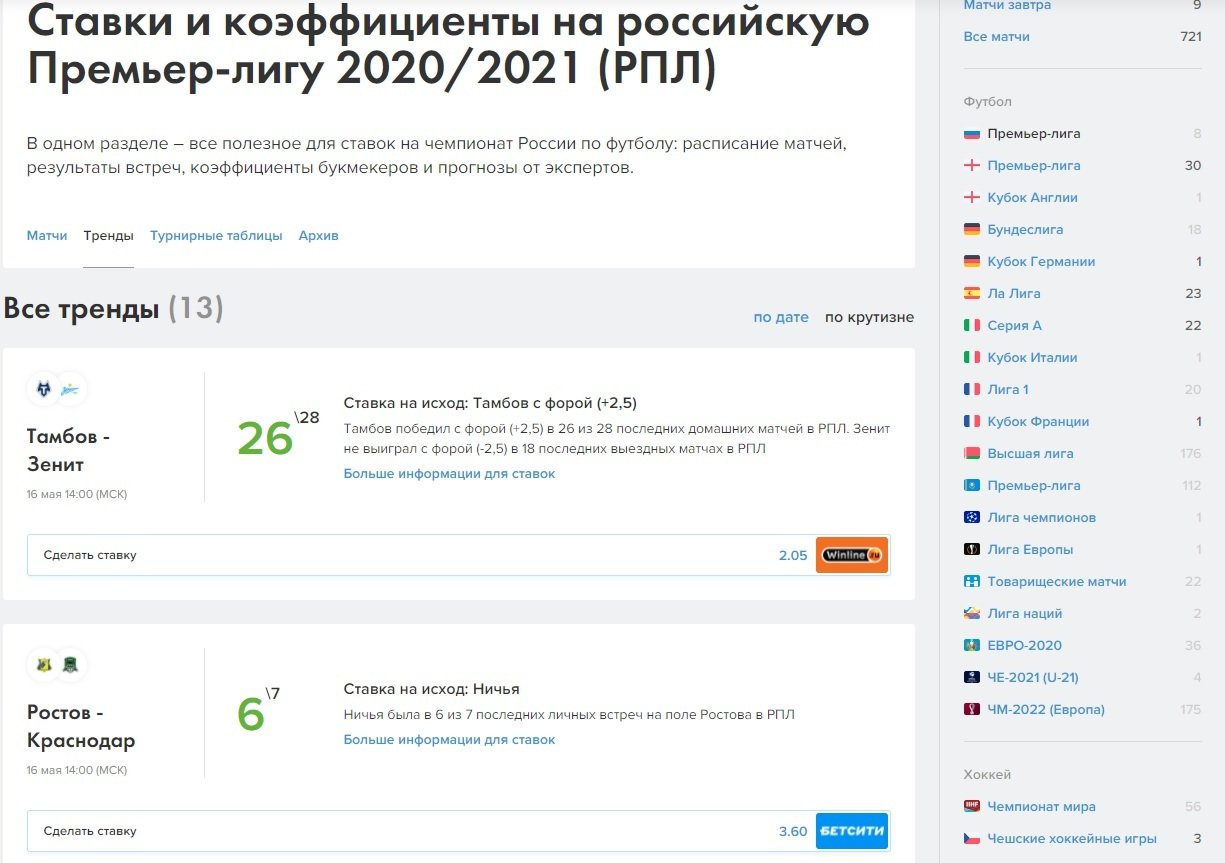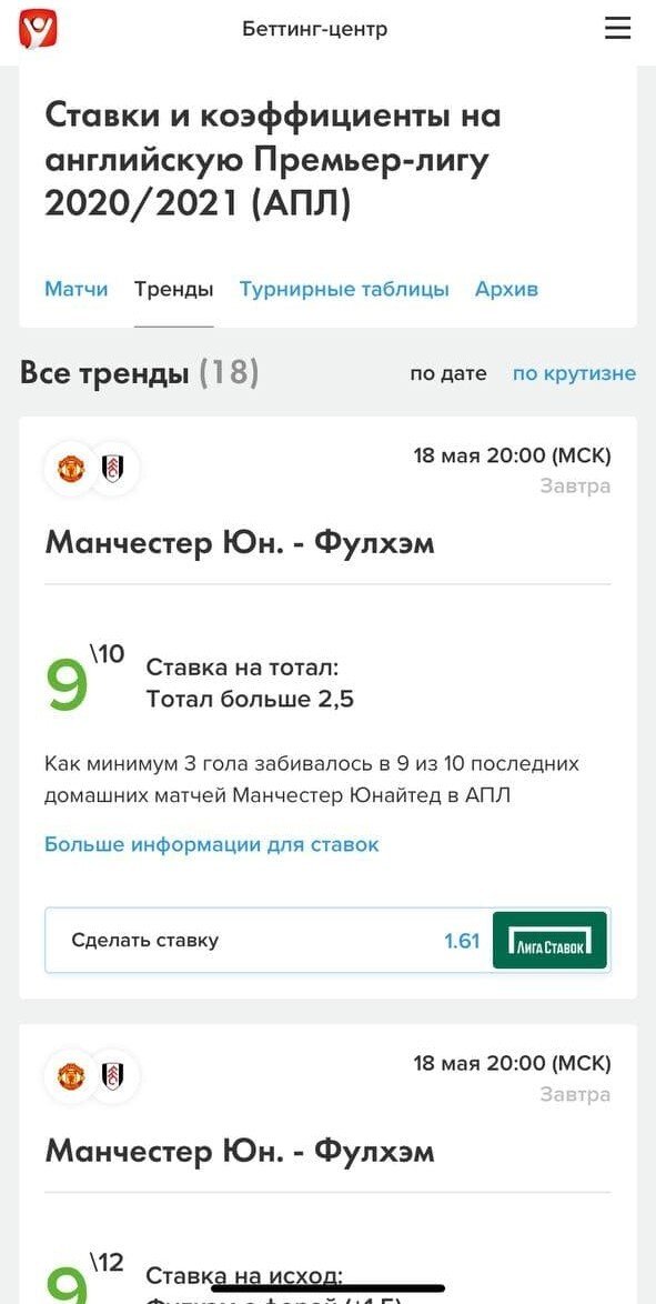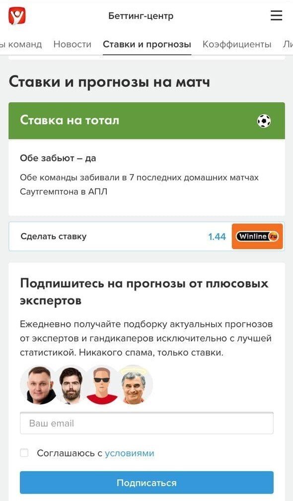 Под новостями расположился блок «Ставки и прогнозы» на конкретный матч. Отмечу, что первый пласт ставок на зелёном фоне — это тренды, а не прогнозы в общем понимании этого слова. Сотрудники вручную находят тенденции по последним матчам, выбирают лучшие и оформляют в тренды к каждой встрече. Стандартный набор состоит из ставок на исход и тотал, ближе к игре подыскиваем тренд на угловые и жёлтые карточки, а также на другую статистику: удары по воротам, офсайды, фолы и т.д.