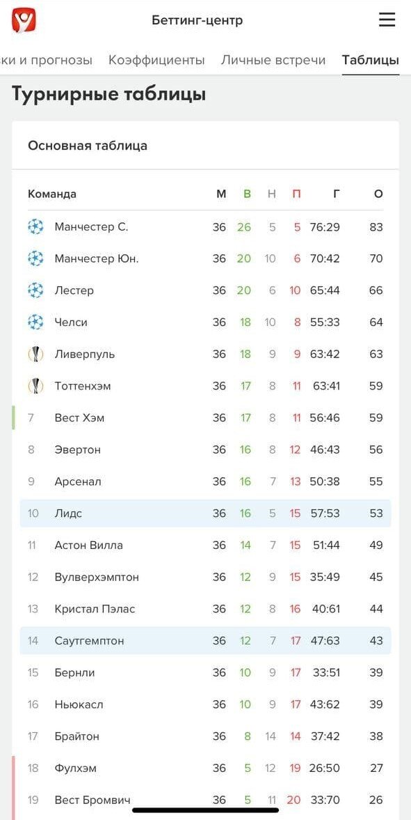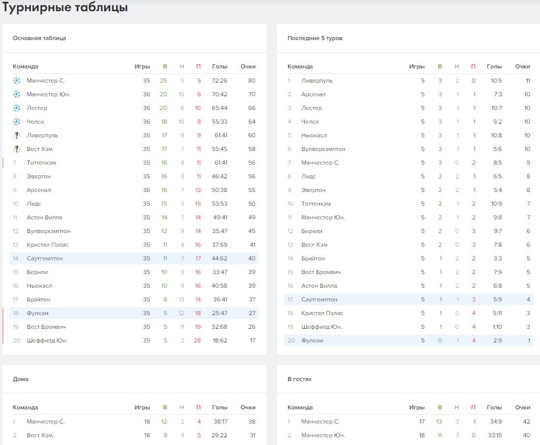 В конце страницы можно найти все матчи команд в этом турнире, а также турнирные таблицы: общую, по результатам последних пяти туров (для оценки формы) и отдельно по каждой команде в соответствующем статусе — дома и на выезде.